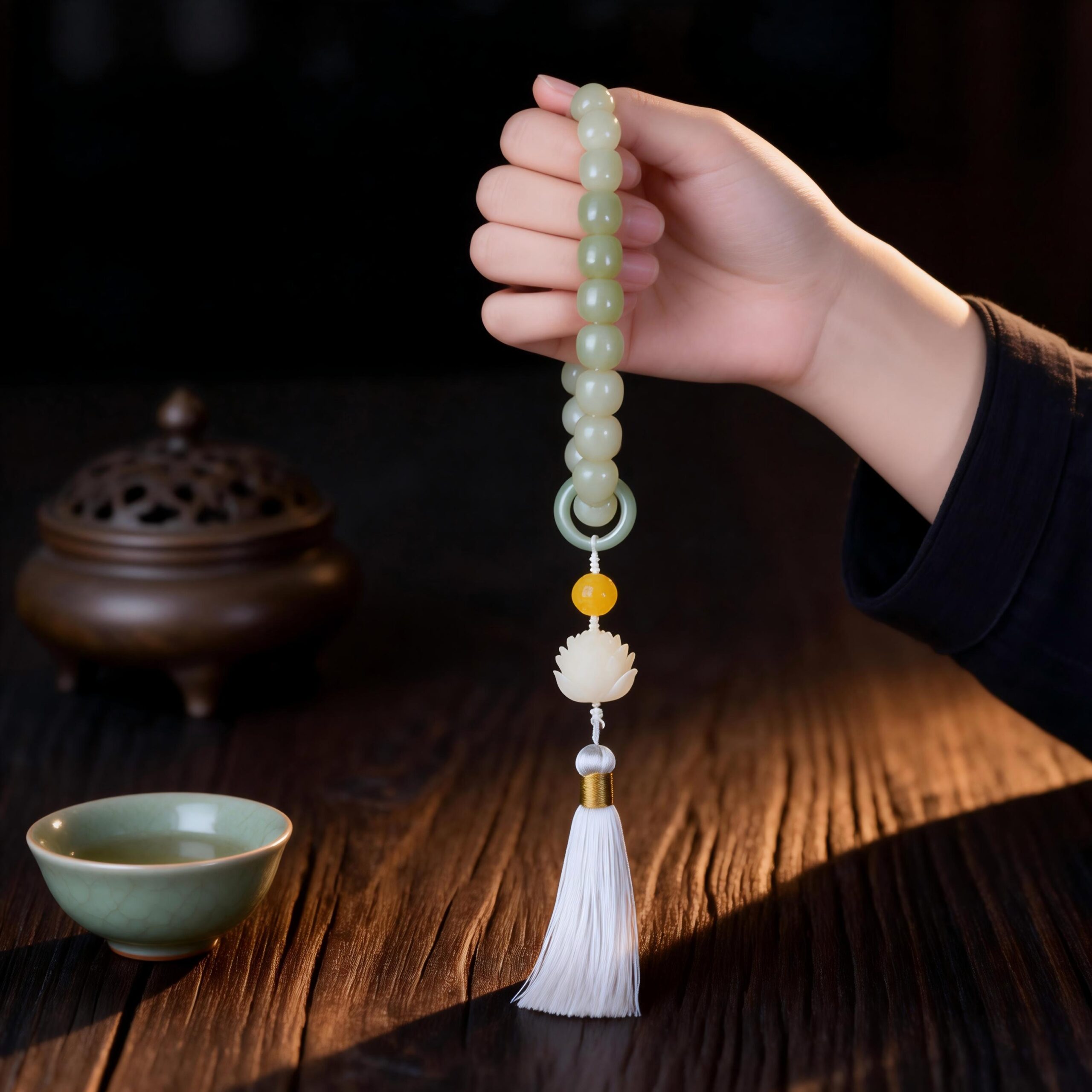 A curated collection of hand-held beads, symbolic bracelets, and visual objects.