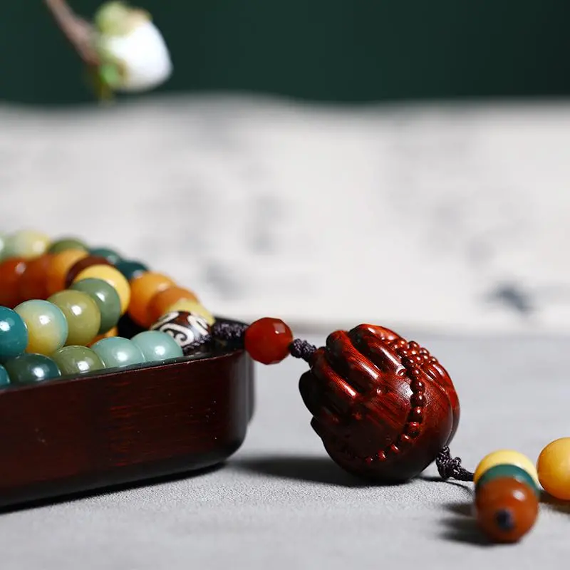 Bodhi originates from the Sanskrit word “Bodhi”, which means “enlightenment, wisdom“. In Buddhism, Bodhi represents the complete understanding and awakening to the truth of the world. The core meaning of Bodhi is enlightenment and wisdom. In Buddhism, Bodhi is translated as “jue”, which means enlightenment. Bodhi bracelets can remind us to constantly maintain awareness of all things in the world, use wisdom to perceive the truth, and thus achieve inner liberation. Bodhi is not only a symbol, but also an important practical tool in Buddhist practice. Reciting Bodhi beads helps to focus the mind, enhance concentration and focus, and assist in spiritual cultivation. Wearing or holding Bodhi beads is believed to bring inner peace and tranquility, reduce anxiety and stress. Buddhism believes that twirling Bodhi beads while chanting sutras or meditating can help people focus their minds and calm complex thoughts. Nowadays, many people wear Bodhi bracelets, hoping to remind themselves to “slow down” through its symbolism.The shape of the Buddha’s hand resembles symbolizing the removal of pain from all sentient beings and the soothing of the soul.