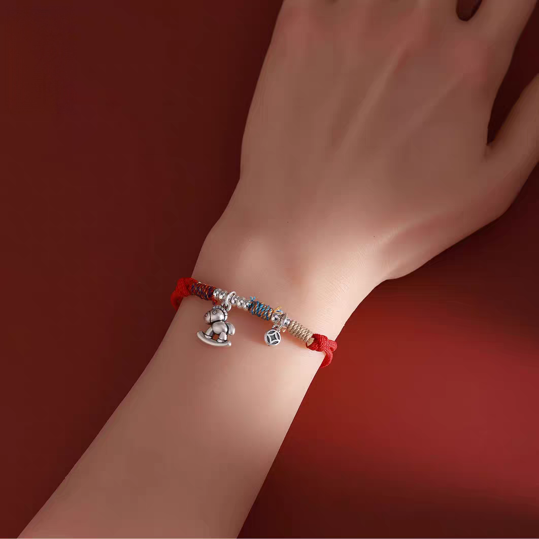 This bracelet is handwoven from deep red cotton string and finished with a small horse symbol — a form long associated in East Asian culture with momentum, resilience, and forward movement.