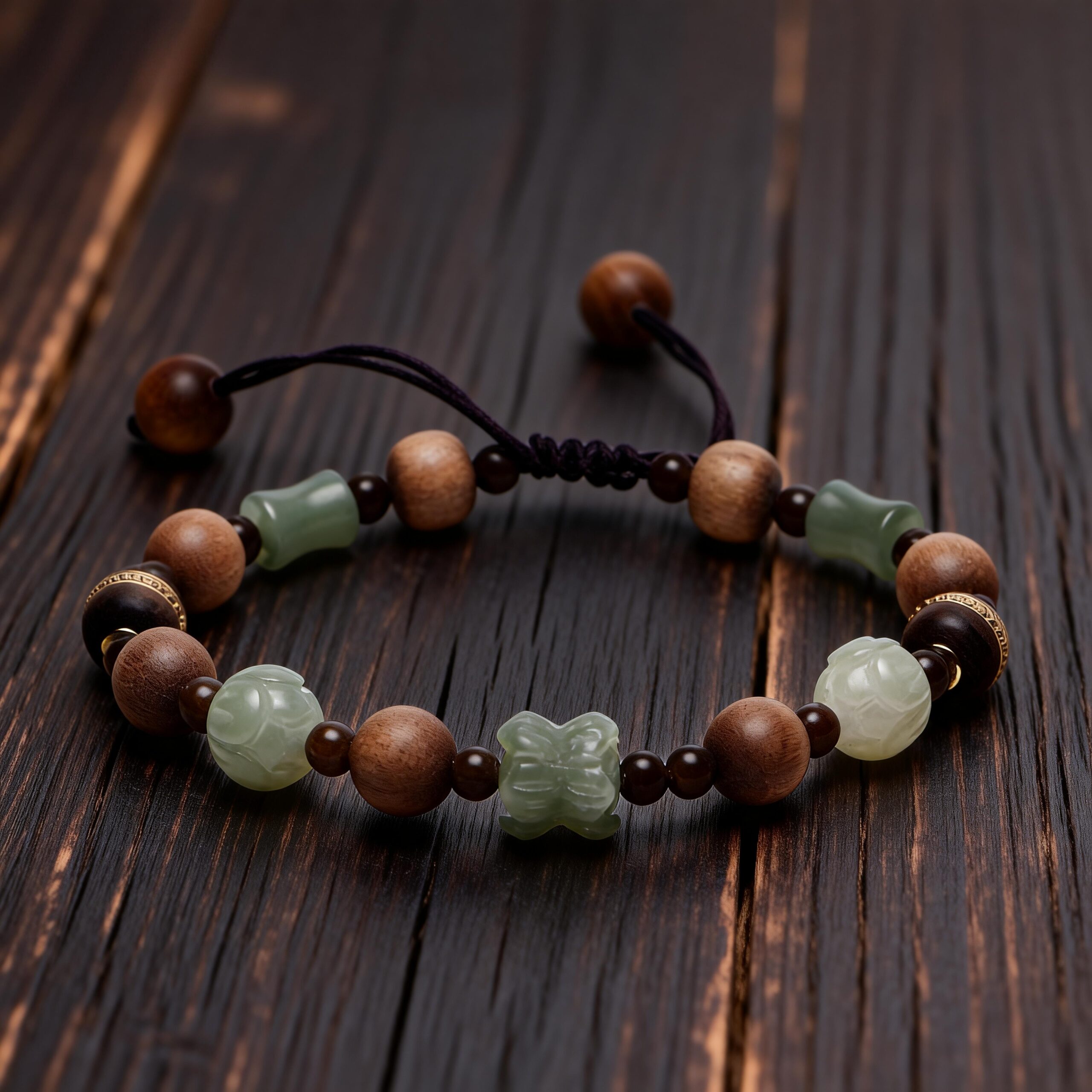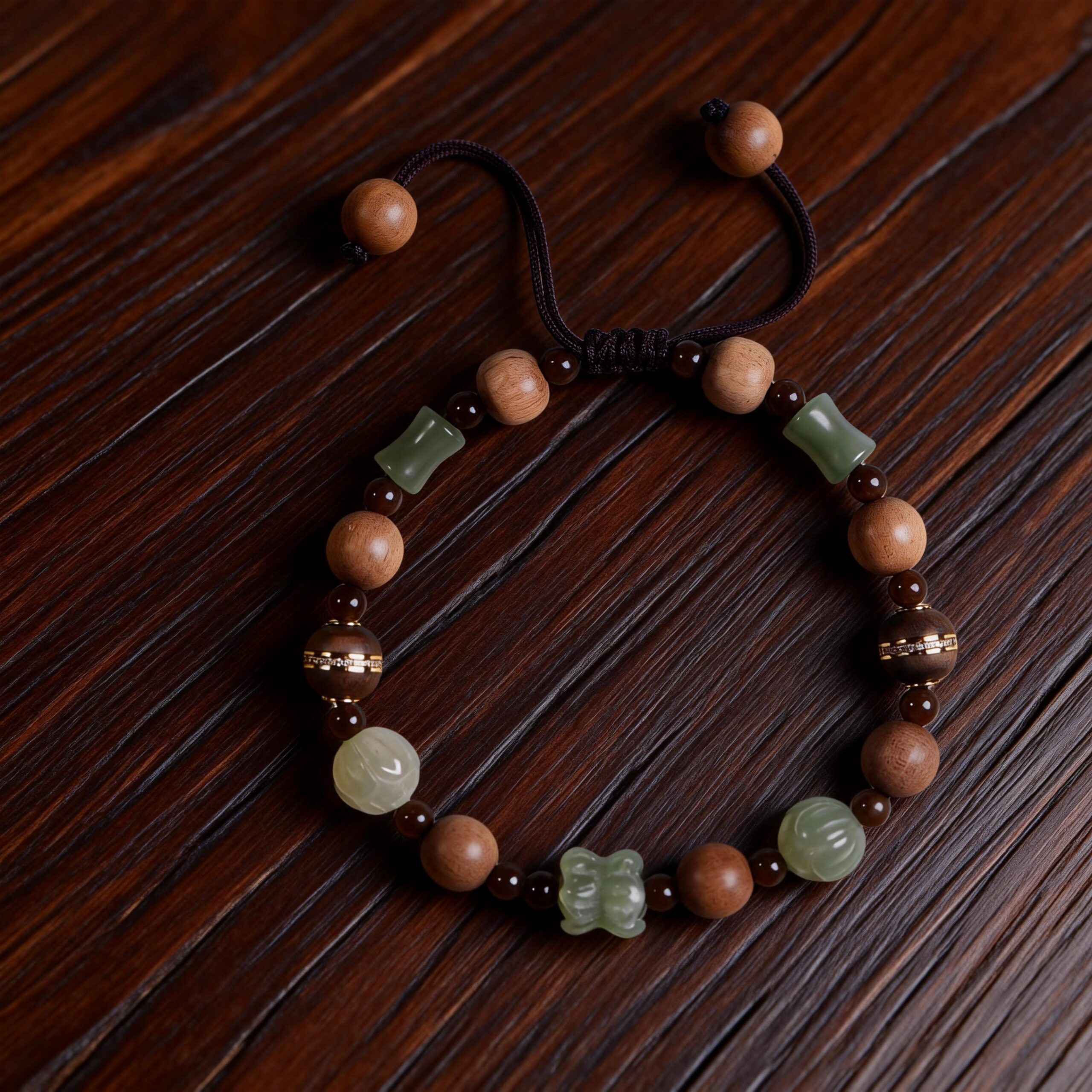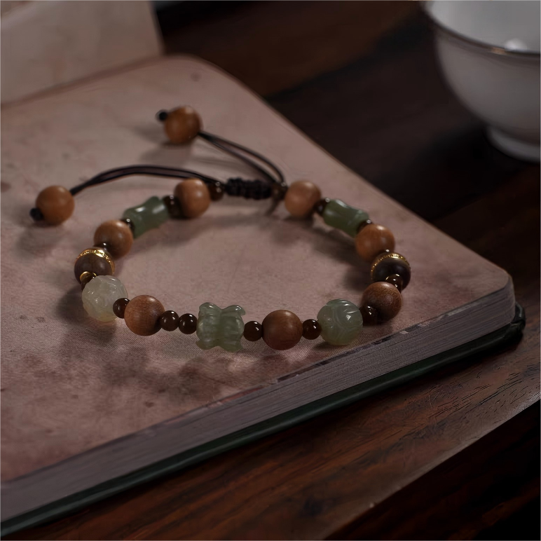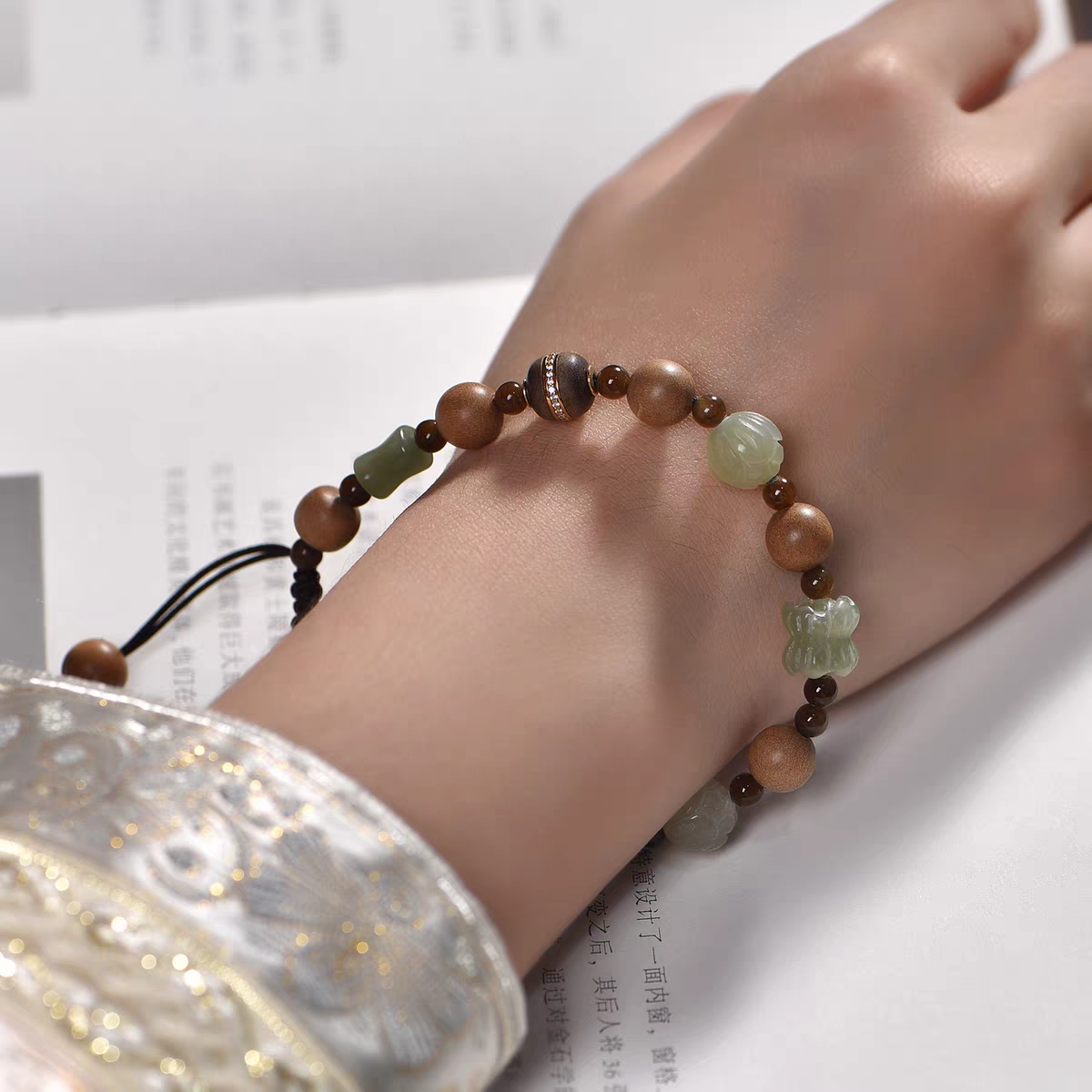 Handcrafted Cord Bracelet with Old Mountain Sandalwood and Hetian Jade Accents