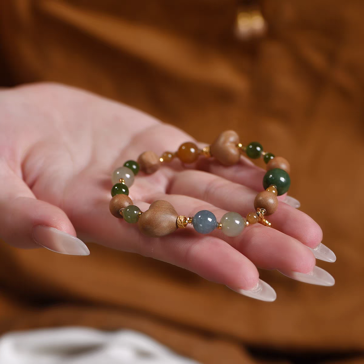 • Heart-cut sandalwood beads paired with classic round beads