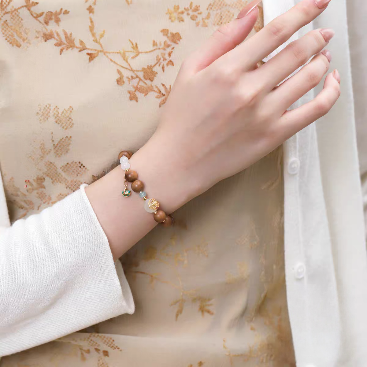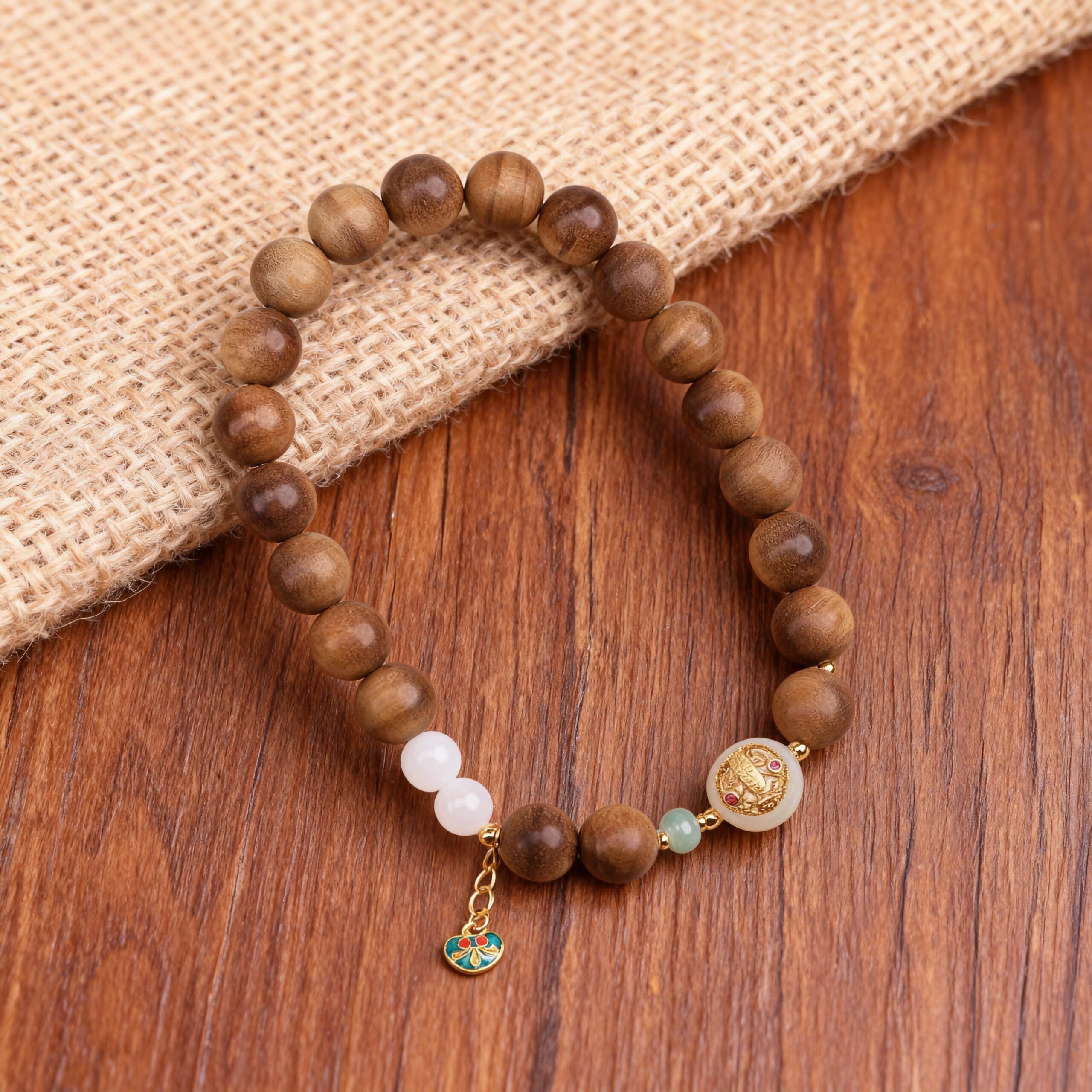 The sandalwood forms the grounding base, while Hetian jade and gold-plated silver act as quiet highlights — creating contrast without tension. The small charm detail adds movement and a delicate finishing touch, enhancing the bracelet’s sense of refinement.