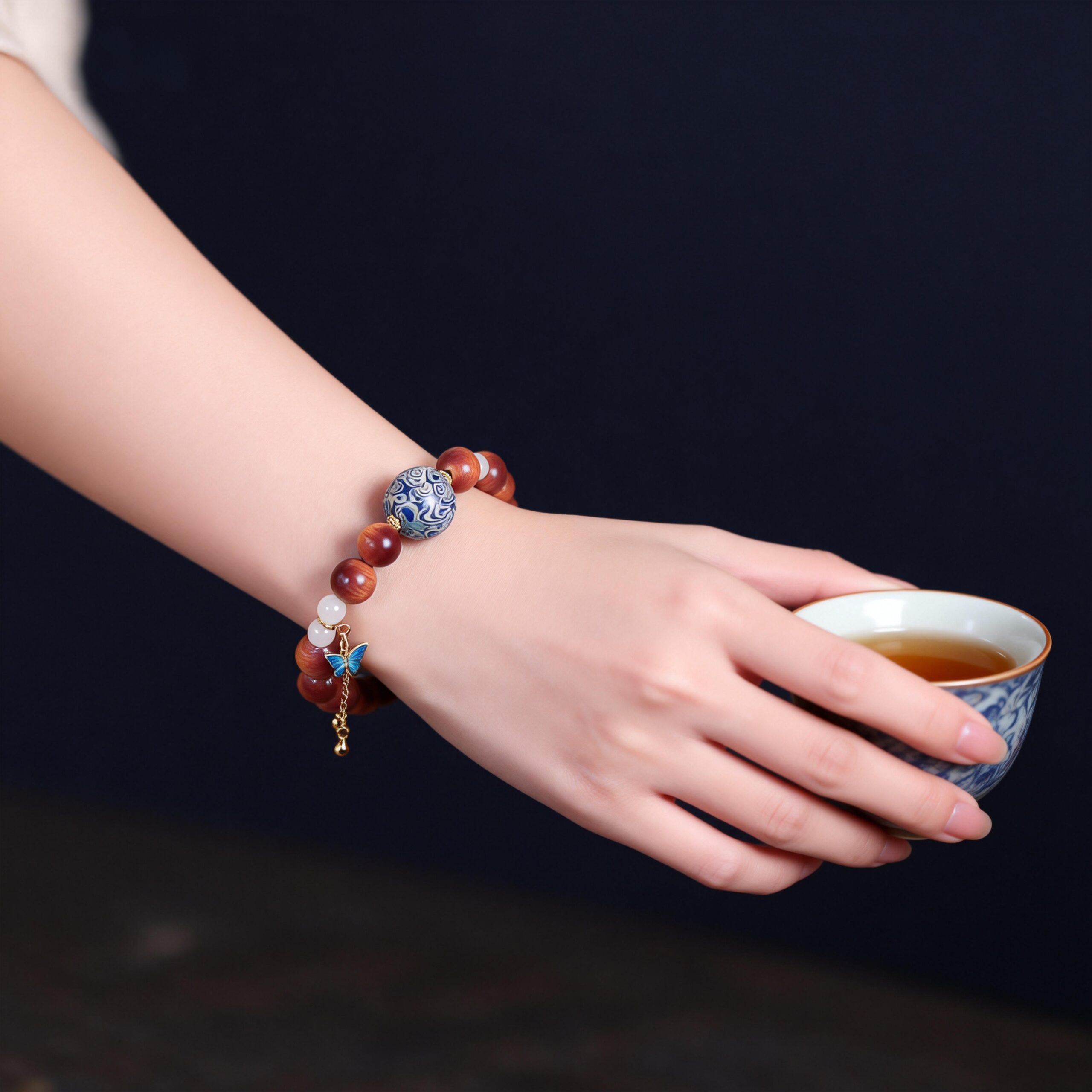 The lacquered bead introduces movement — a trace of classical Chinese craft.