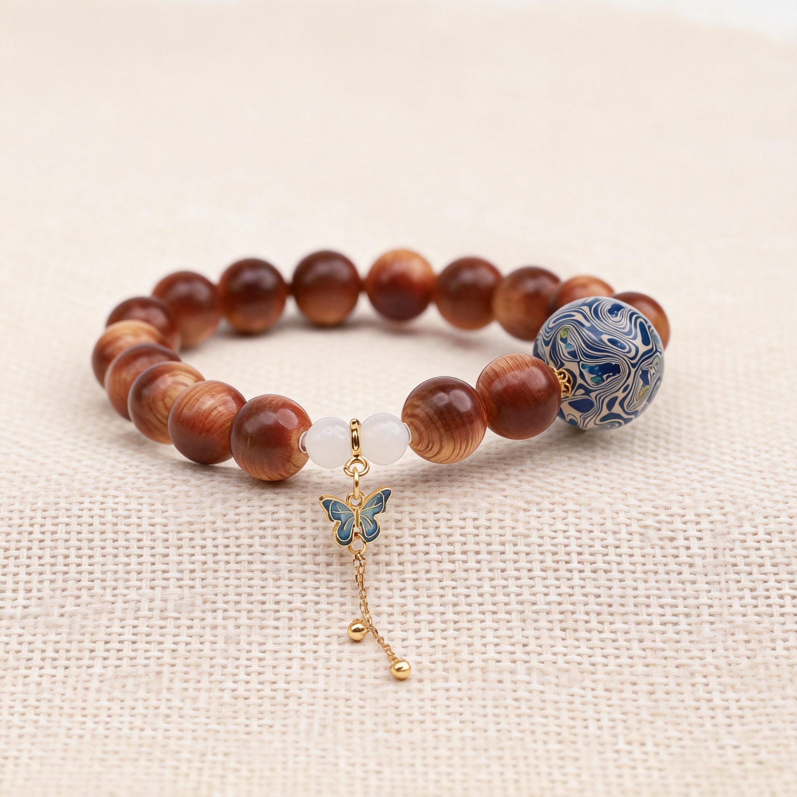 This bracelet brings together aged wood, mineral jade, and traditional craftsmanship —