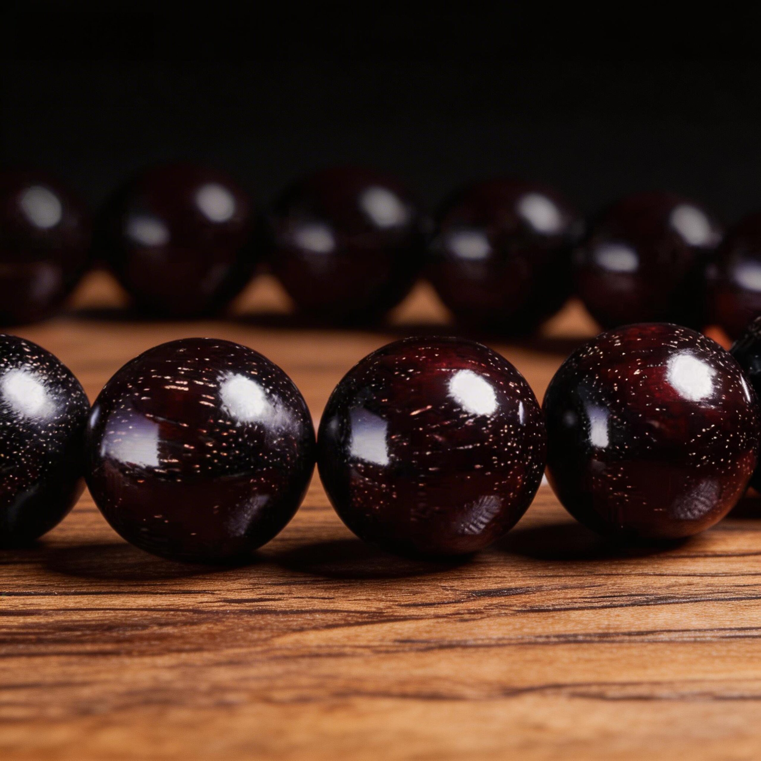 The fine golden grain visible on some beads is a natural formation within the wood structure.